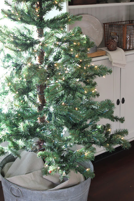 This galvanized bucket that I bought for $2 is one of them. The tree is a hand me down and the homespun fabric was less than $3 at the thrift store.