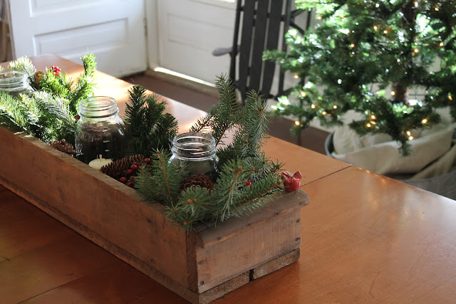 This long box is a $2 estate sale find, it was built to be a tool box but with some pine boughs and mason jars holding candles inside of it it becomes the perfect centerpiece.