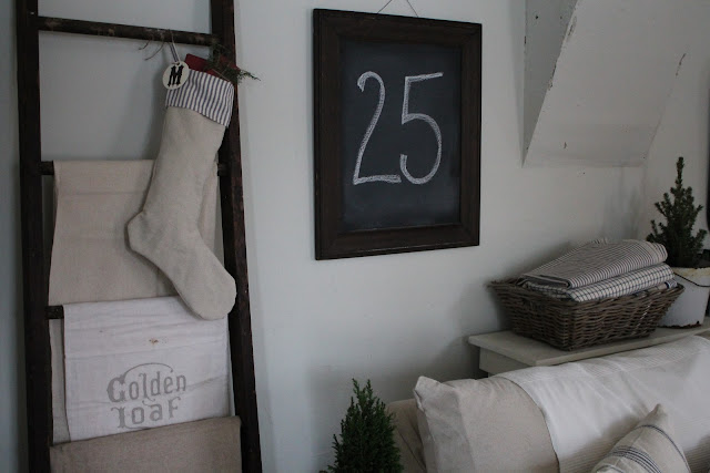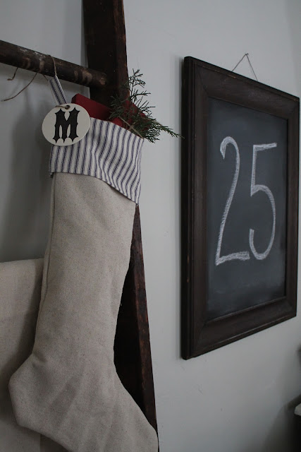 I made this stocking with a left over scrap of the painters drop cloth I used to make our sofa slipcover.