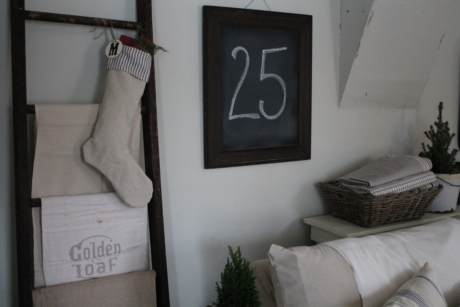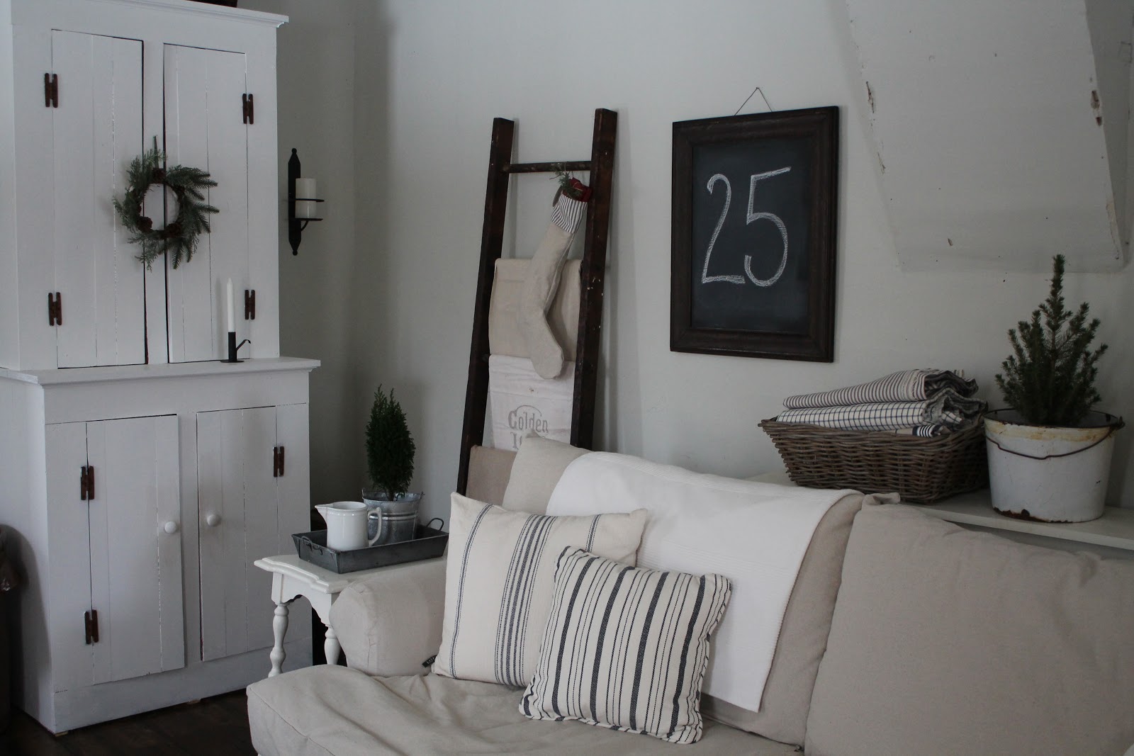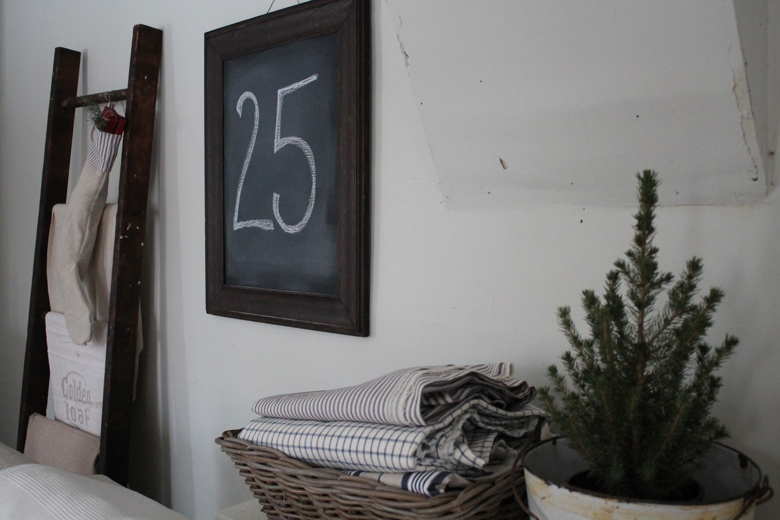 An Ikea "As Is" basket holds some of the ticking fabric that I can't get enough of, and an old enamelware bucket makes the perfect mini tree holder. These little trees were only $3 at Aldi, what a deal!
