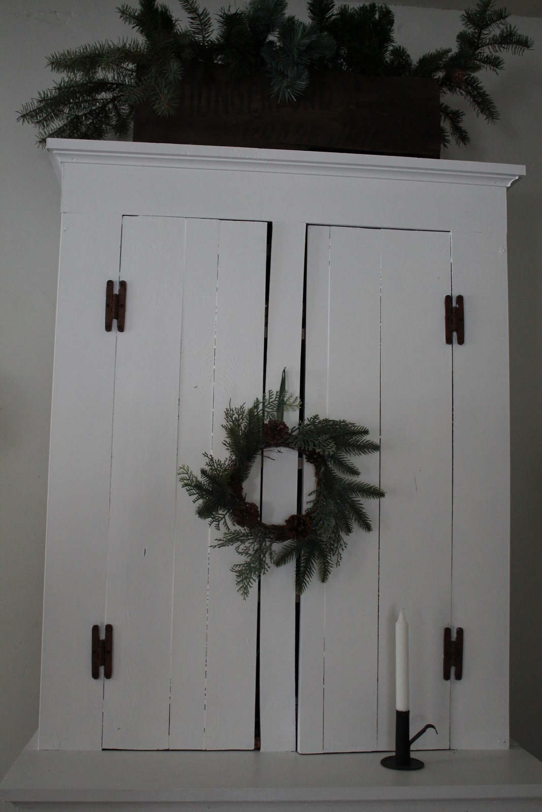 I got the wreath on our stepback for less than $2 because all of it's pine cones had fallen off...I just reglued some of my own on. And I filled an old box I bought for $1 with some pine boughs from our yard.
